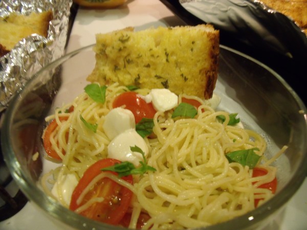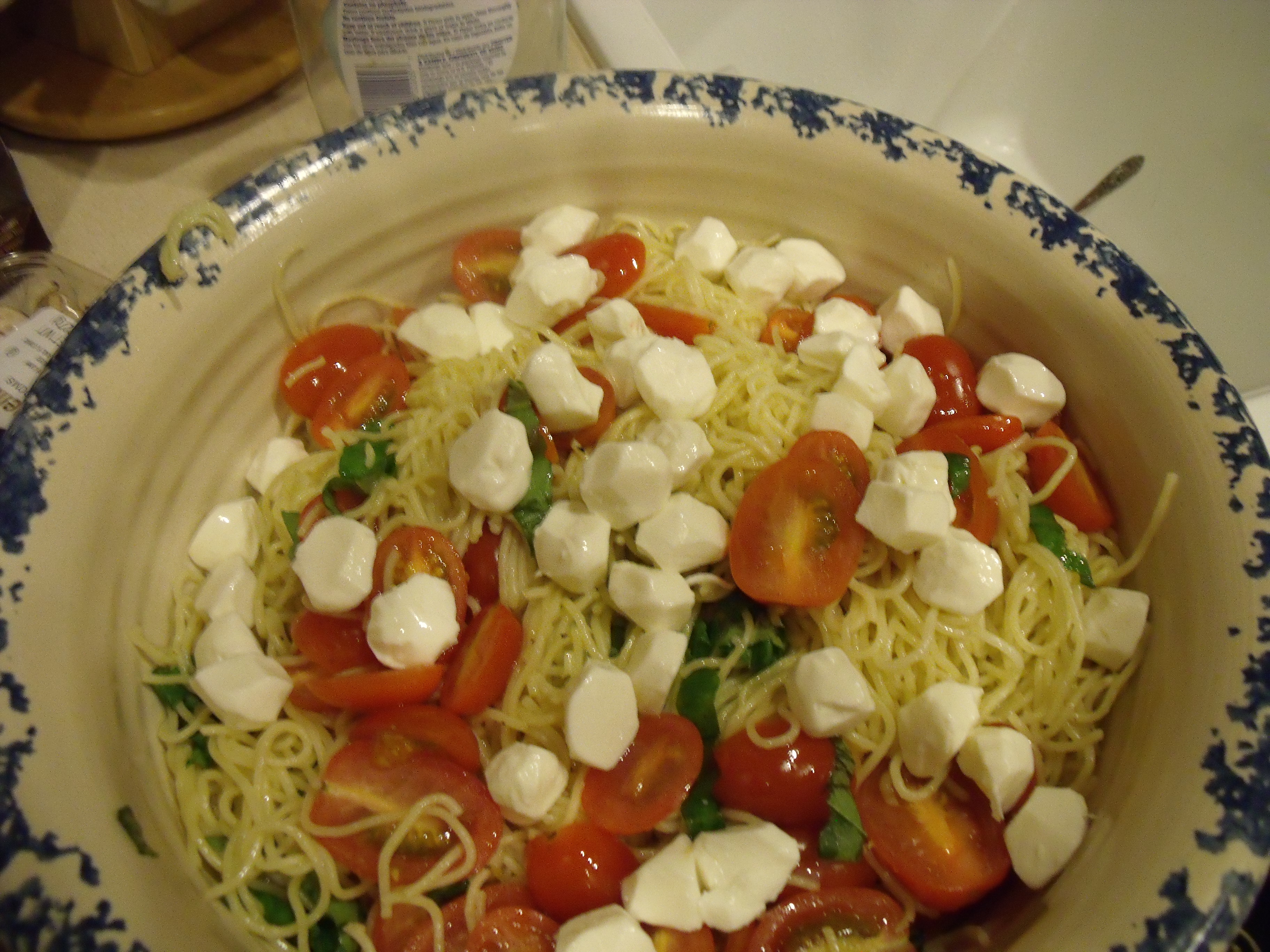 This dish is essentially a Mozzarella Caprese Pasta. Same ingredients as the salad, but add pasta and forget the balsamic vinegar.