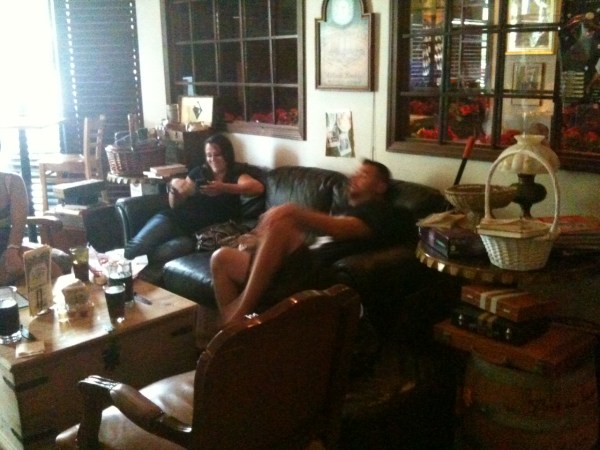 To the right is another room, which is designed to be like a family room. There’s a sofa, some chairs, a coffee table, and a giant beer station. Like, literally… giant beers…