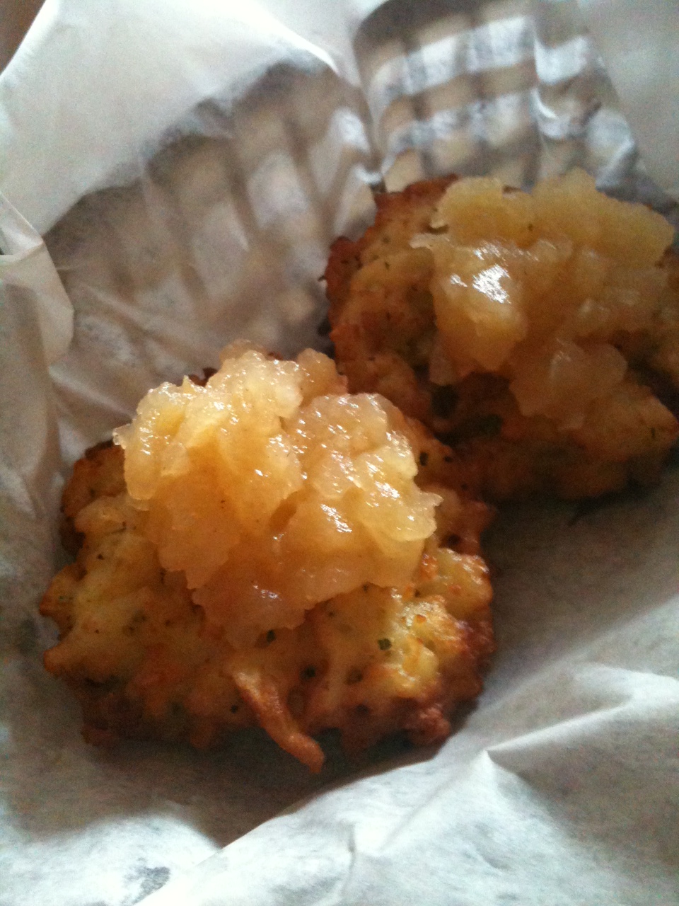 Going back to the potato latkes (or pancakes), there are two ways to eat them: with sour cream or with applesauce. Guess which one I get?