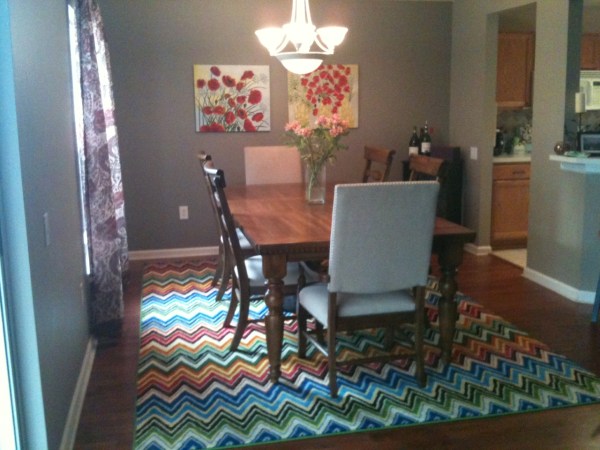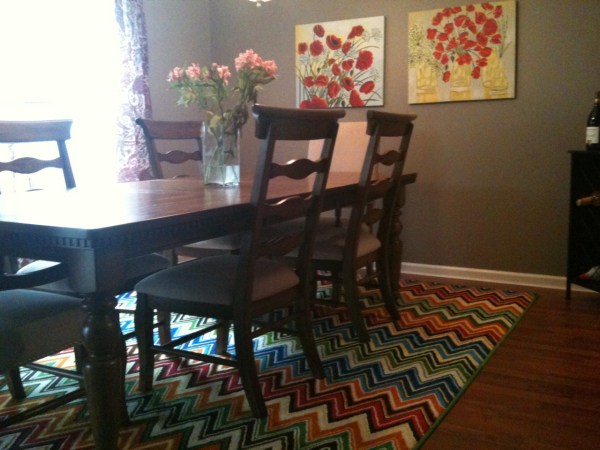 I just love how the bright colors pop with the neutrals of the gray paint (which was a dilemma too, see here) and the dining room table. And since our house is an open floor plan, rugs are essential to break up the space – it creates a room when there isn’t one.