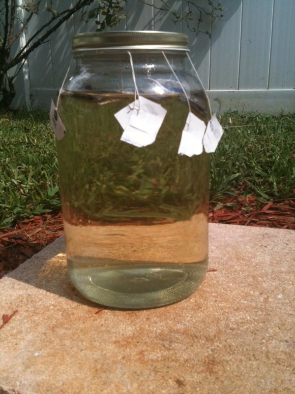Fill your jar with water, approx. 1 gallon (make sure you use something with a lid). Place 6 tea bags in the water (you can add more or less depending on how strong or weak you like your tea).