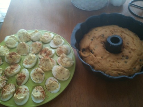 Deviled Eggs are always a necessity. And so is a 3-ingredient Pumpkin Butter Cake.
