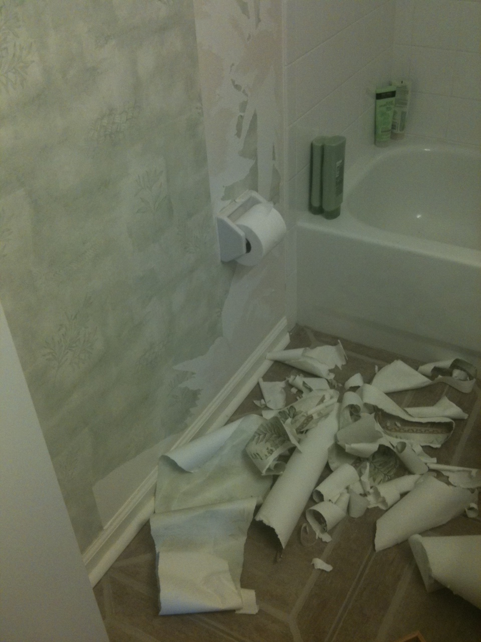 Two stuffed trash bags and 6 hours later, I finally finished. And although it didn’t go as quickly as I would’ve liked, the white walls are way better than the old lady wallpaper that was once there before it.